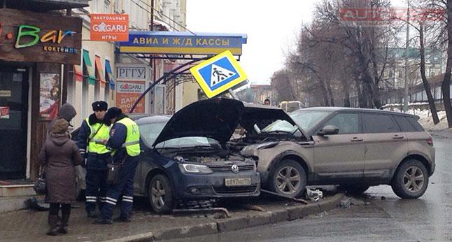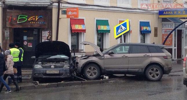 Авария случилась в 11:45 часов 7 марта. Автоледи на Volkswagen Jetta двигалась по ул. Университетская со стороны ул. Кремлевская в сторону ул. Баумана, где на пересечении с ул. Профсоюзная не выполнила требование дорожного знака “Уступи дорогу”, столкнулась с Land Rover и вылетела на тротуар.