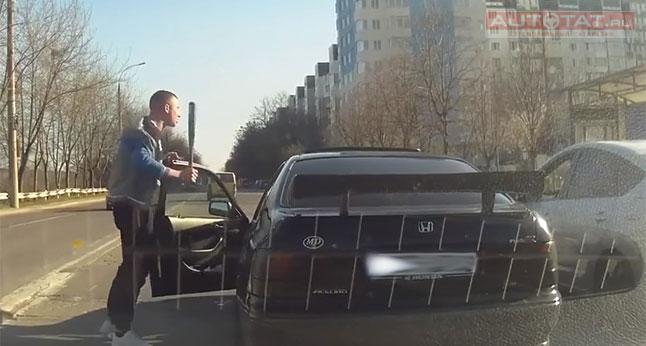 Автор ролика умалчивает из-за чего возник конфликт на дороге, однако водитель черной Honda был настроен воинственно - он выскочил из машины и нервно помахивал битой. Вот только мужчина из Toyota Prius оказался не робкого десятка и провел с молодым человеком разъяснительную беседу.