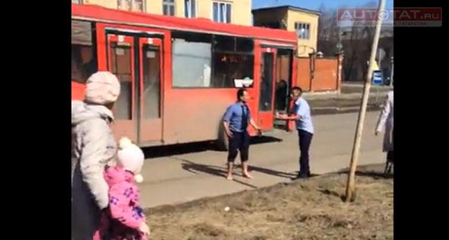 Вчера днем, в районе остановки по ул. Журналистов два водителя автобуса выясняли отношения прямо на проезжей части. Разборки двух мужчин удалось заснять на видео одному из многочисленных очевидцев.