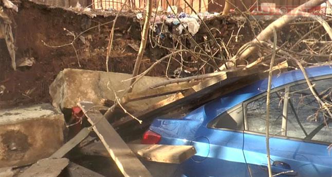 В результате талые воды подмыли основание забора, который рухнул на припаркованный Chevrolet Cruze - деревянные балки промяли кузов автомобиля и разбили заднее стекло. По словам водителя полной страховки у него нет, поэтому неизвестно кто будет ему возмещать ущерб.