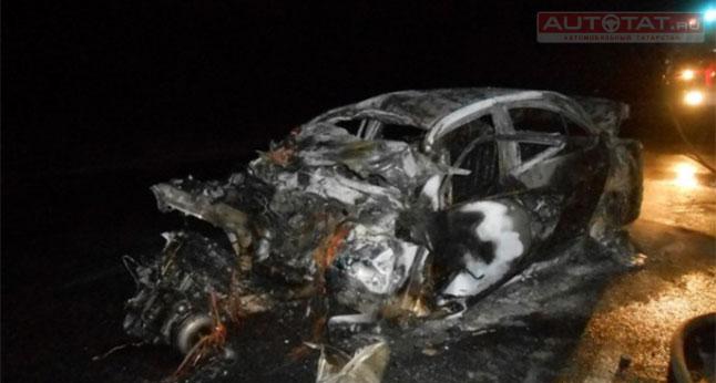 В результате столкновения иномарка загорелась. Чуть позже огонь перекинулся и на грузовик МАН. Оба автомобиля сгорели. Сообщается, что в салоне Toyota ехали жених и невеста. Все подробности трагедии выясняются.