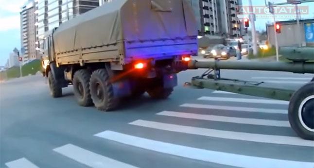 В Интернете набирает популярность видеоролик, на котором гаубица отцепляется от КамАЗа и катится на толпу зазевавшихся пешеходов прямо посреди города.