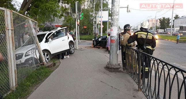 В результате столкновения иномарку выкинуло с дороги прямо на металлическое ограждение, а у “Приоры” серьезно поврежден моторный отсек.