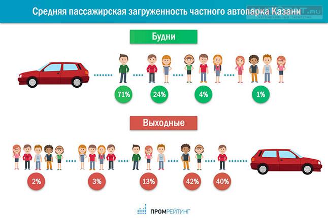 Нужно отметить, что цифры по будням сформированы с учетом дневных колебаний. То есть сюда входят как пики насыщенности автомобилей пассажирами (раннее утро, родители завозят детей в школы, а иногда и друг друга на работу, совместные вечерние поездки по магазинам и развлекательным заведениям, и в какой-то степени обеденные часы – время подвоза коллег). Другими словами, если просто выйти на улицу Казани, в среду днем, одиноких автомобилистов насчитается еще больше. Важно и другое, «автоединоличники» всецело доминируют в классических утренних и вечерних пробках. Только представьте себе эту картину – среднестатистический красный казанский автобус НЕФАЗ по паспарту вмещает примерно 100/105 пассажиров, занимая при этом площадь в 30 м². Распределенные по одному в своих личных автомобилях те же самые казанцы занимают уже площадь в 1000 м², то есть в 33 раза большую. Но об этом чуть позже.