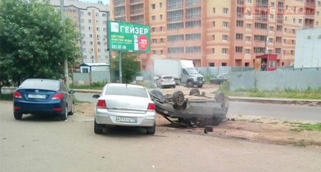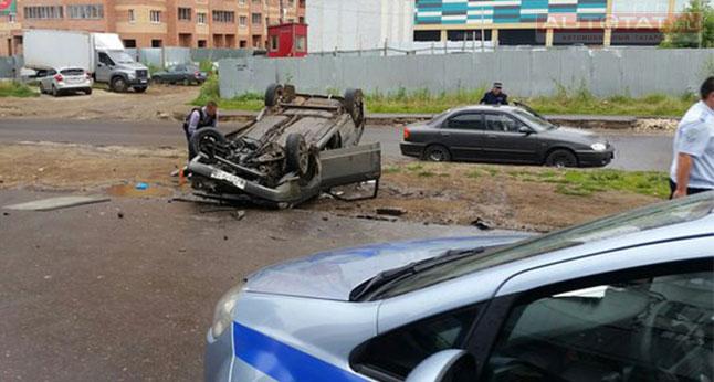 В Казани ВАЗ-2114 протаранил два автомобиля и перевернулся