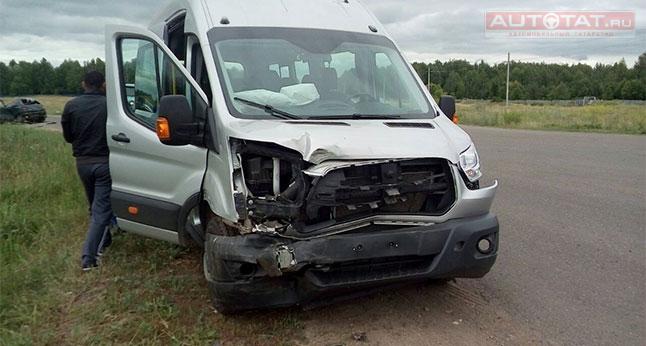 Недалеко от Елабуги вахтовый автобус Ford Tranzit не уступил дорогу и протаранил автомобиль ОКА. В результате легковушку буквально разорвало пополам.