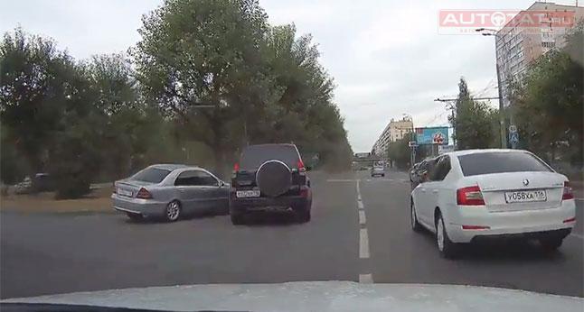 В этот момент владелец “Мерса” самоуверенно выехал на крайнюю левую полосу при развороте - как итог, Toyota врезается в иномарку.