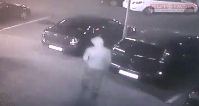 На кадрах записи видно, как неизвестный в капюшоне поджигает LADA Granta, а затем быстро убегает с места преступления.