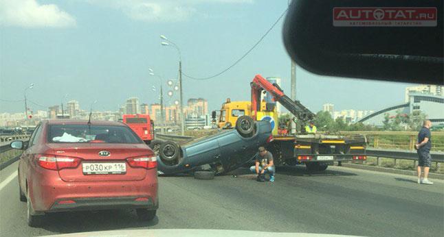 По предварительной информации, водитель LADA Granta двигался в сторону пр. Ямашева. На мосту он не справился с управлением и перевернулся.