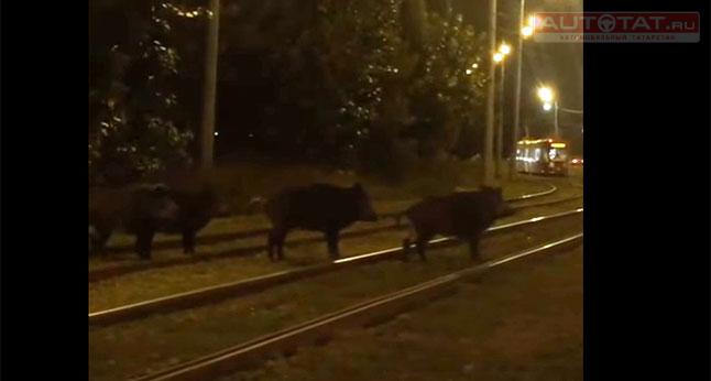 В соц. сетях появилось видео, на котором стая диких кабанов пытается перебежать трамвайные пути между вокзалом и Кировской дамбой в Казани.