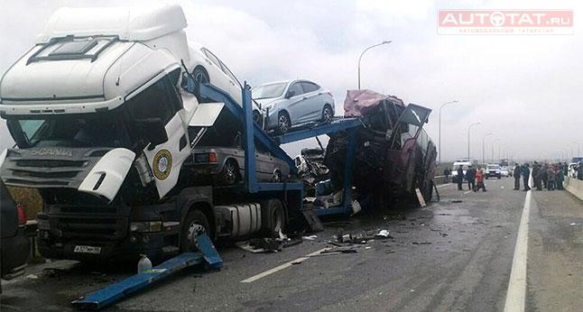 Известно, что автобус следовал по маршруту Москва-Ереван. По предварительной информации, его водитель не заметил припаркованный на обочине автовоз и буквально залетел на него.