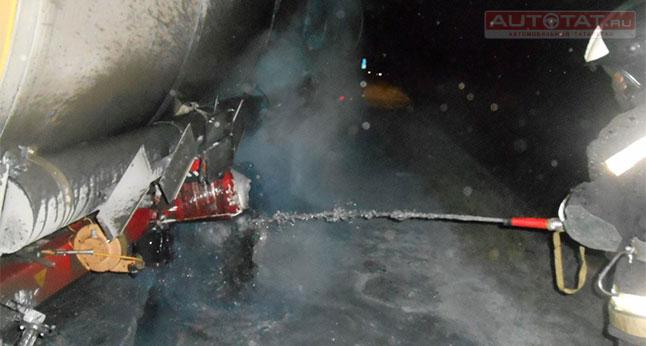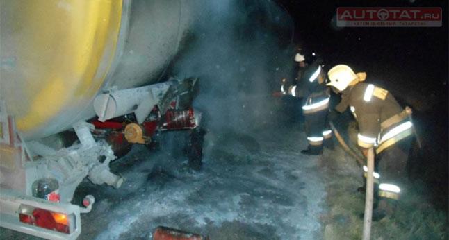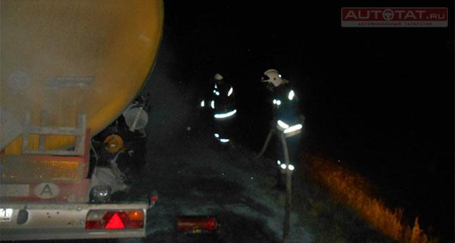 Спустя 12 минут на место прибыли пожарные расчеты, которые достаточно быстро потушили огонь. Позже выяснилось, что в процессе движения у бензовоза MAN, перевозившего 24 тонны моторного масла, загорелось колесо.