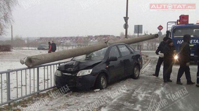 Сегодня приблизительно в 13 часов дня на проспекте Яшьлек в Набережных Челнах на автомобиль LADA Granta упал столб. Об этом пишут в соц. сетях.
