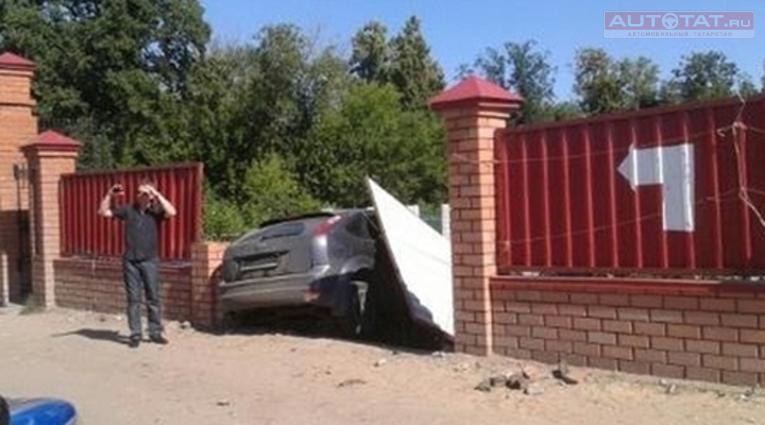 В Казани вчера вечером автомобиль "Ford Focus" на скорости влетел в забор Архангельского кладбища. Машину остановило только после столкновения с двумя массивными надгробиями. Сила удара была такой, что один из металлических листов ограждения, взлетев, рухнул на крышу иномарки. Даже кирпичная кладка разлетелась во все стороны, ее обломки повредили памятник погибшим во времена политических репрессий.