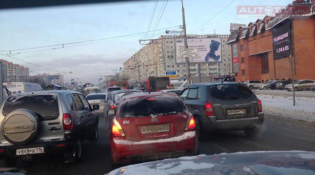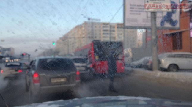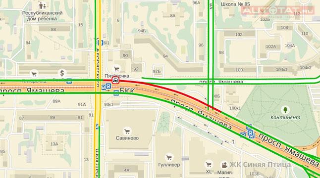 В правом ряду на пр. Ямашева легковой автомобиль “притерся” к красному автобусу. Пострадавших в ДТП нет, однако на пересечении пр. Ямашева и ул. Адоратского затруднено движение.