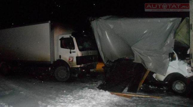 Дорожно-транспортное происшествие случилось на 1281 км трассы М5. Водитель грузовика Mercedes врезался в стоящую Газель, которую отбросило на грузовик Volvo.