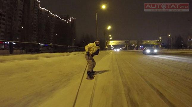 Снег и гололед спровоцировал казанских экстремалов прокатиться по ночным дорогам города на сноубордах, а после выложить ролик об этом в сеть.