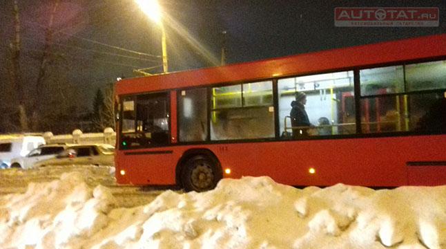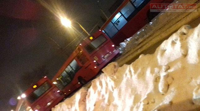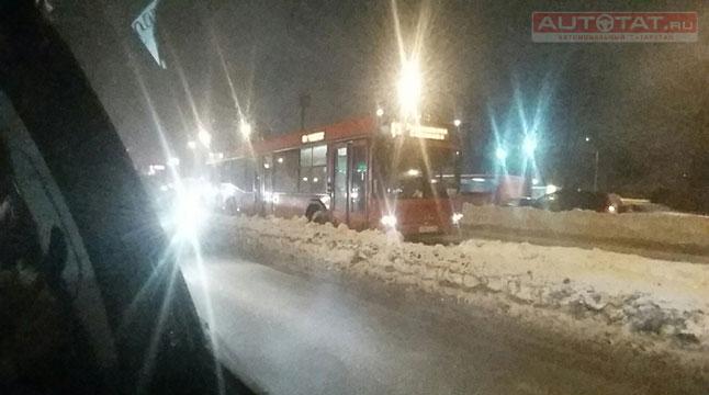 В Казани автобус не смог объехать пробку и застрял на трамвайных путях. ВИДЕО