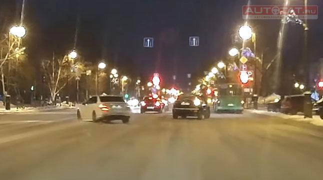 На кадрах видеозаписи видно, как владелец иномарки сначала уходит в занос на пустой дороге, а затем “дает угла” на встречке и проезжает перекресток на красный сигнал светофора.