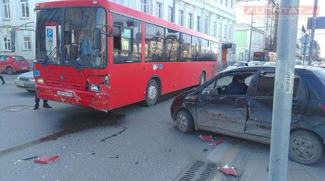 Авария случилась в 16:32 на пересечении ул. Т. Гиззата и ул. Лево-Булачная. По предварительной информации, 51-летний водитель Daewoo Matiz в нарушение п. 13.9 ПДД не выполнил требование знака 2.4 “Уступи дорогу” и столкнулся с автобусом НЕФАЗ 15-го маршрута.