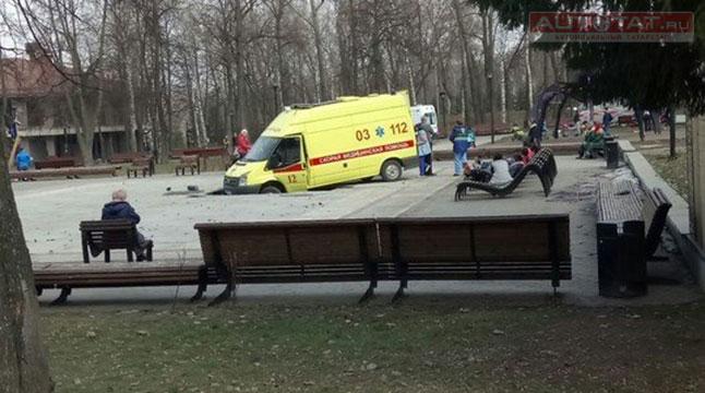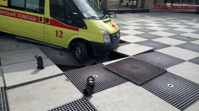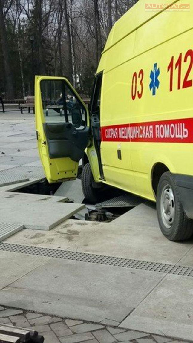 В парке им. Горького скорая помощь провалилась в пешеходный фонтан. Фото