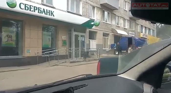 На кадрах видно, как водитель просто кидает посылки на крыльцо банка.
