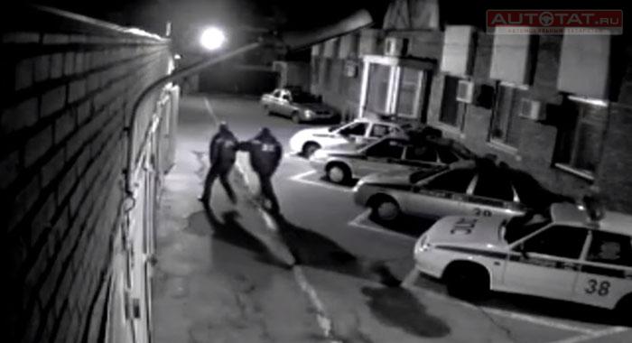 На записи камер наружного наблюдения видно, как группа нетрезвых сотрудников ДПС в форме сначала что-то бурно обсуждают, а затем садятся в гражданский автомобиль и уезжают.