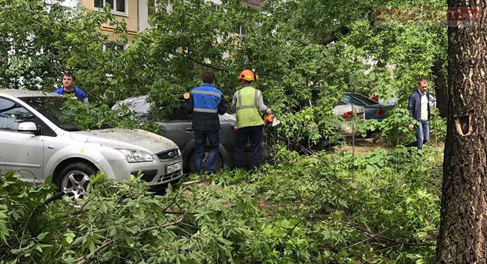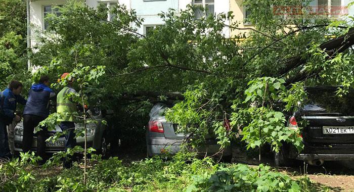 Сильный ветер в Казани: дерево упало на припаркованные машины. ФОТО