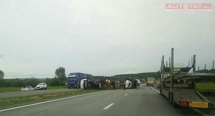 В минувшие выходные в Мамадышском районе на трассе М7 перевернулась фура с новыми автомобилями. Об этом сообщают пользователи в соц. сетях.