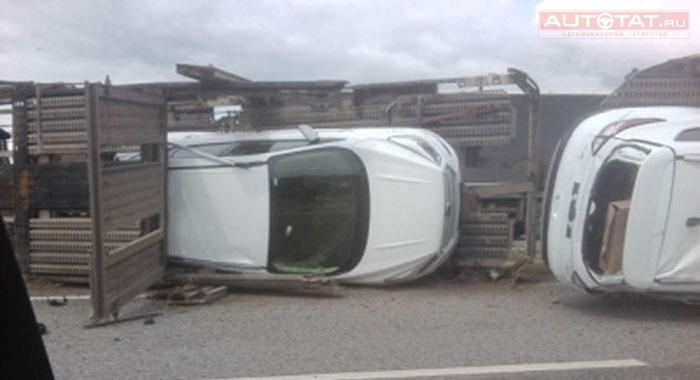 В Мамадышском районе перевернулся автовоз с новыми иномарками. ФОТО