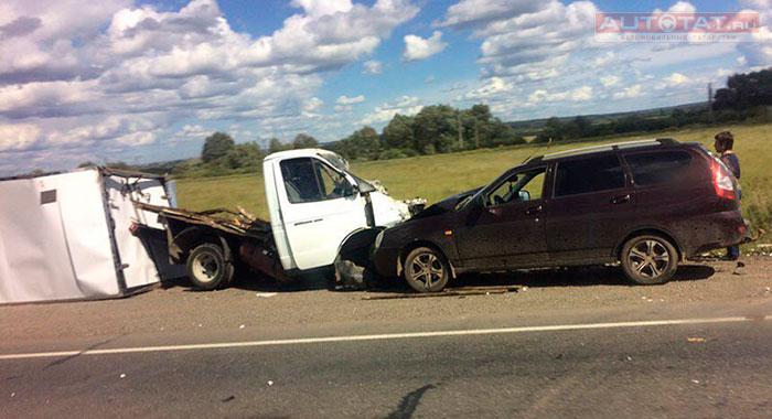 По предварительной информации, водитель Газели выехал на встречную полосу, где столкнулся с фурой “Урал”. От удара грузовик откинуло на LADA Priora, а фуру на встречку, где она протаранила уже другую Газель.