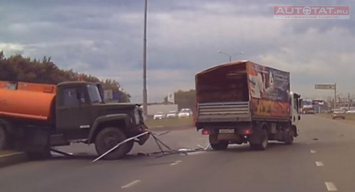 В Набережных Челнах водитель бензовоза не уступил дорогу при развороте и протаранил грузовик. Момент ДТП попал на камеру видеорегистратора.