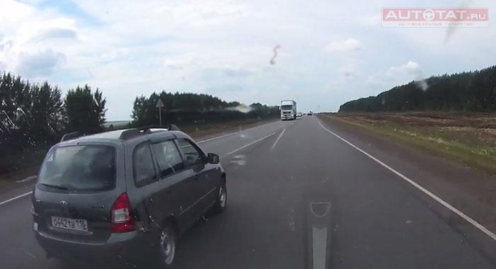 В соц. сетях появилось видео ДТП на трассе в Татарстане. Водитель LADA Kalina не убедился в безопасности обгона и улетел в кювет.