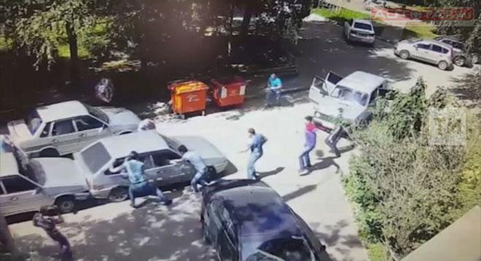На кадрах записи видно, как легковой автомобиль со злоумышленниками едет по двору, когда с двух сторон его блокируют машины сотрудников отдела по борьбе с групповой преступностью.