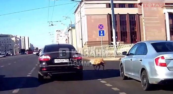 На записи с видеорегистратора проезжающей машины видно, как животное движется по улице Татарстан сначала в правом ряду, а затем неожиданно для всех меняет направление и пересекает проезжую часть.
