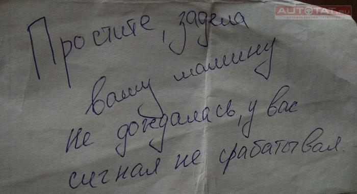 Инцидент случился на парковке магазина Леруа Мерлен в районе 14 часов. В записке сказано, что у Toyota RAV4 не сработала сигнализация, поэтому вероятная виновница ДТП оставила записку и 1000 рублей на покрытие причиненного ущерба.