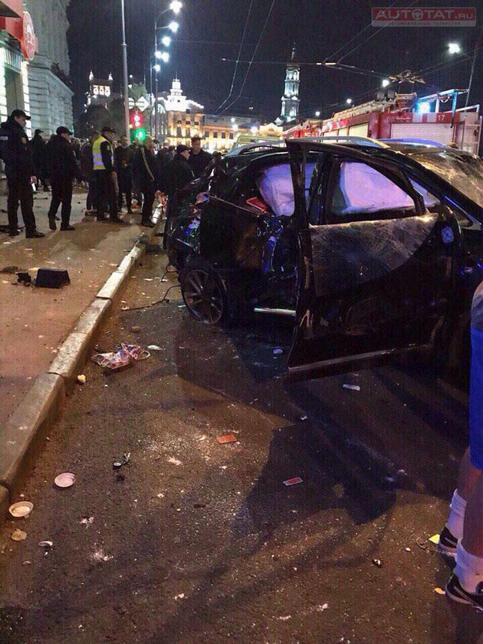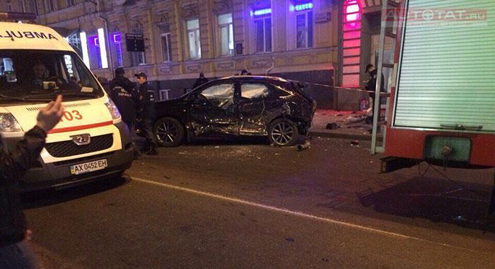 По предварительной информации, водитель “Лексуса” выехал на красный сигнал светофора, столкнулся с Volkswagen Touareg, а затем врезался в столб, перевернулся и вылетел на тротуар прямо на людей.