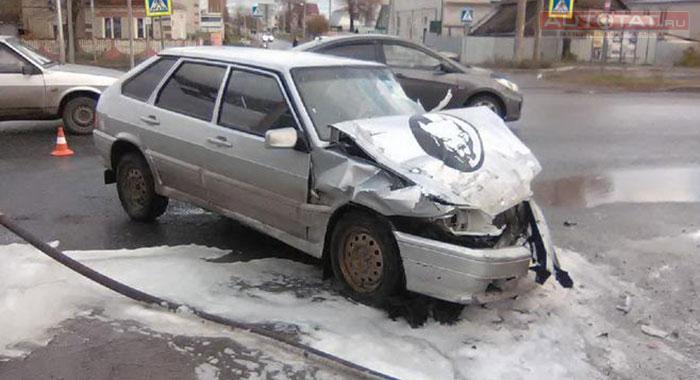 По предварительной информации, водитель грузовика Mercedes не уступил дорогу ВАЗ-2114 на перекрестке. В результате произошел разлив топлива, а 26-летний владелец легковушки получил различные травмы.