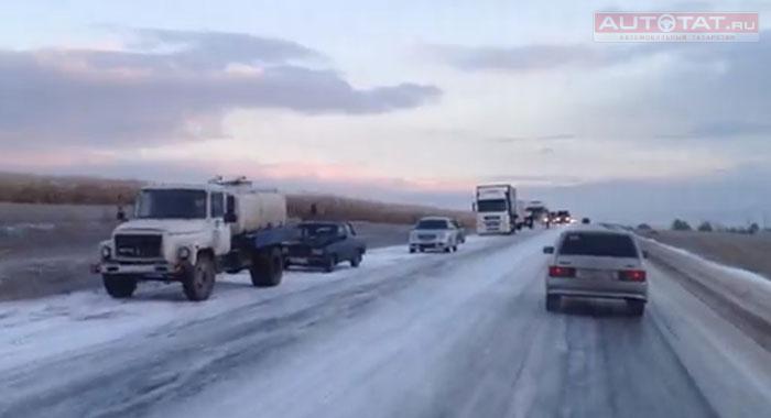 Из-за гололеда образовался затор на трассе Челны-Заинск