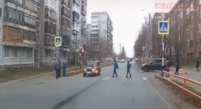 Инцидент случился 19 октября. На записи с видеорегистратора видно, как нетрезвая автоледи на ВАЗ-2107 пытается проскочить “зебру”. В этот самый момент дорогу начинают переходить школьники.