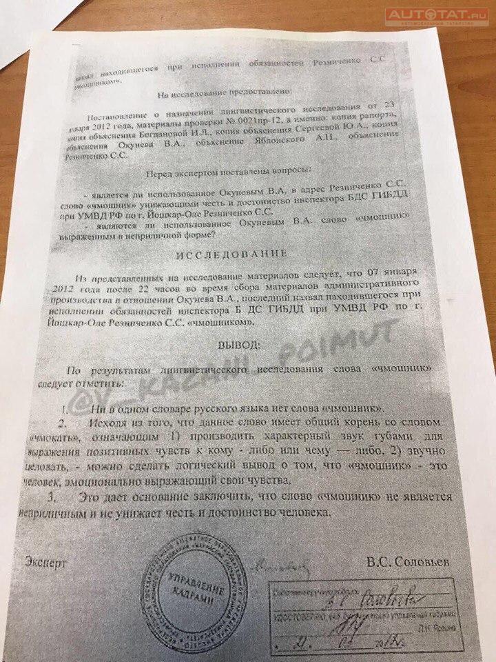 Все началось 7 января 2012 года, когда во время оформления административного производства водитель Окунев назвал находившегося при исполнении сотрудника ГИБДД из Йошкар-Олы “чмошником”.