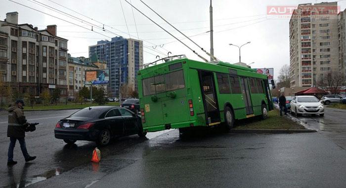 Пытаясь избежать столкновения, водитель троллейбуса вывернул руль вправо и вылетел на газон. О пострадавших не сообщается. За рулем иномарки сидела девушка.