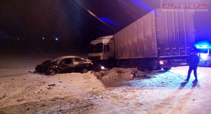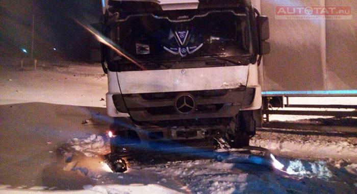 Минувшей ночью в Лаишевском районе произошло столкновение большегруза и иномарки. Водителя легковушки и его 2-летнюю дочку увезли в больницу, сообщает “Камская новь”.