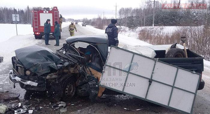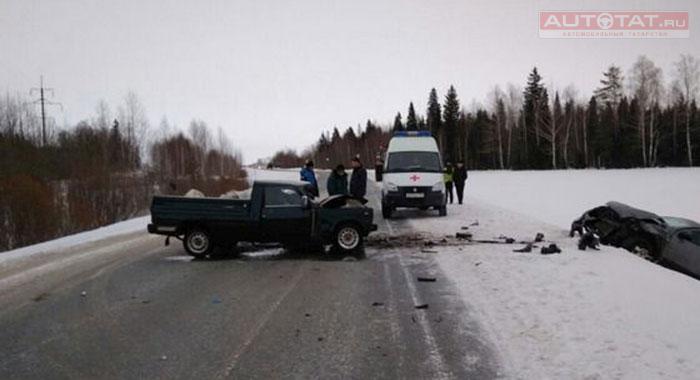 Авария случилась на 92-м километре трассы Казань-Малмыж. Там столкнулись лоб в лоб Nissan Qashqai и Иж 2717. От удара иномарку выкинуло в кювет, а кабина пикапа превратилась в груду металла, где и был зажат водитель.