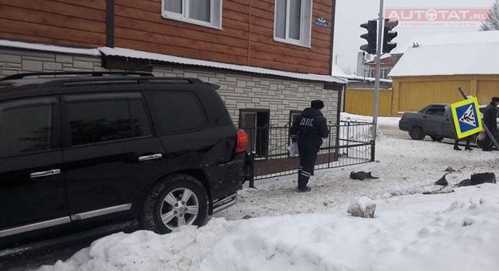 На видеозаписи видно, как на перекресток с разных направлений выезжают два автомобиля. В результате столкновения ВАЗ 21099 разворачивает, а Toyota Land Cruiser сносит дорожный знак и вылетает на тротуар. К счастью, в этот момент там не было пешеходов.