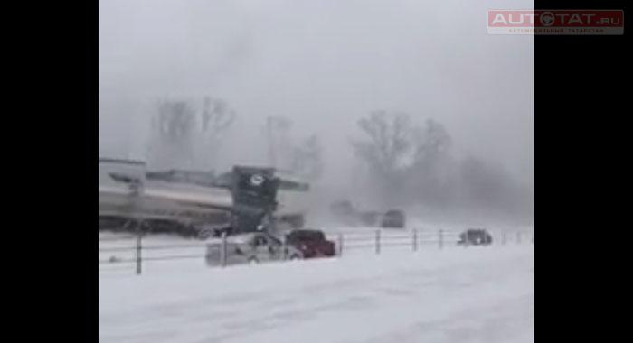 Появилось видео, где автомобили один за другим врезаются друг в друга из-за снегопада.