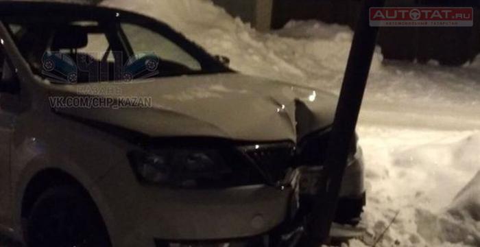 Сегодня ночью в Казани автомобиль Skoda протаранил дорожный столб. Фотография с места ДТП появилась в социальных сетях.