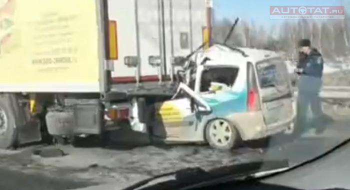 В Зеленодольском районе произошло страшное ДТП со смертельным исходом. Водитель автомобиля LADA Largus влетел под фуру и погиб на месте.