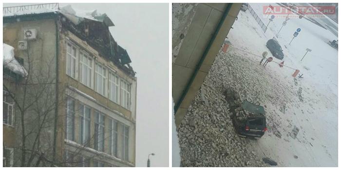 Сегодня рядом с 22-ым заводом в Казани произошел обвал фасада здания. В результате припаркованный автомобиль буквально расплющило.