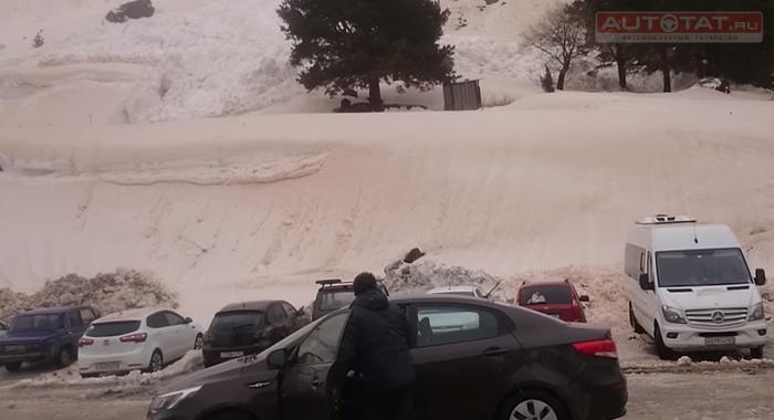 В Интернете появилось видео, на котором лавина накрывает припаркованные машины толстым слоем снега на приэльбрусской поляне Азау.